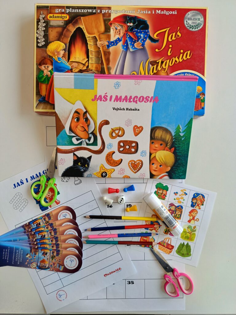 Spotkanie rozpoczęło się od rozmowy o grach planszowych – ich rodzajach, elementach i mechanizmach działania. Następnie uczniowie wysłuchali baśni „Jaś i Małgosia” autorstwa Vojtěcha Kubašty w atrakcyjnej formie pop-up i omówili jej treść oraz morał.