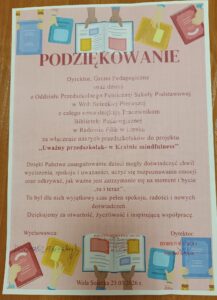 23 marca 2026 roku w Bibliotece odbyło się podsumowanie projektu edukacyjnego „Uważny przedszkolak w krainie mindfulness”, realizowanego we współpracy z Publiczną Szkołą Podstawową im. Stefana Żeromskiego w Woli Soleckiej.
