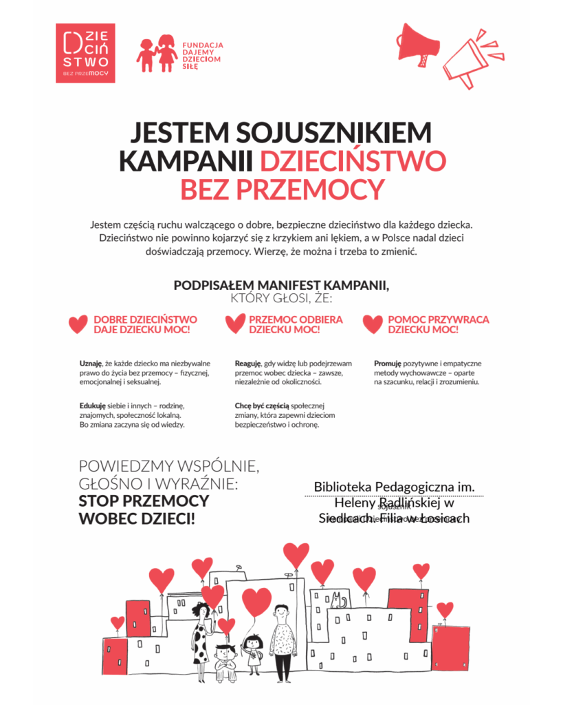 Biblioteka Pedagogiczna im. Heleny Radlińskiej w Siedlcach Filia w Łosicach dołączyła do grona instytucji, które oficjalnie wspierają ogólnopolską kampanię „Dzieciństwo bez Przemocy”, organizowaną przez Fundację Dajemy Dzieciom Siłę oraz Krajową Koalicję na rzecz Ochrony Dzieci. Placówka podpisała manifest kampanii i otrzymała certyfikat potwierdzający jej zaangażowanie w działania na rzecz przeciwdziałania przemocy wobec najmłodszych.