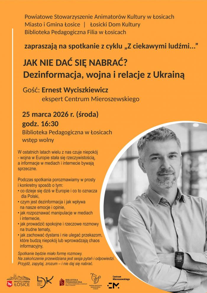 Wydarzenie odbędzie się 25 marca 2026 r. o godz. 16:30 w siedzibie Biblioteki Pedagogicznej w Łosicach. Temat spotkania brzmi: „Jak nie dać się nabrać? Dezinformacja, wojna i relacje z Ukrainą”. Gościem będzie Ernest Wyciszkiewicz – ekspert Centrum Mieroszewskiego.
